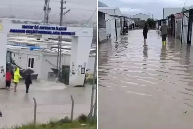 Hatay'da etkili olan şiddetli yağışlar nedeniyle yollar göle döndü, araçlar mahsur kaldı ve konteyner kentler su altında kaldı. Ekipler mahsur kalan araçları kurtarırken, su basan evlerde tahliye çalışmaları yapıldı.