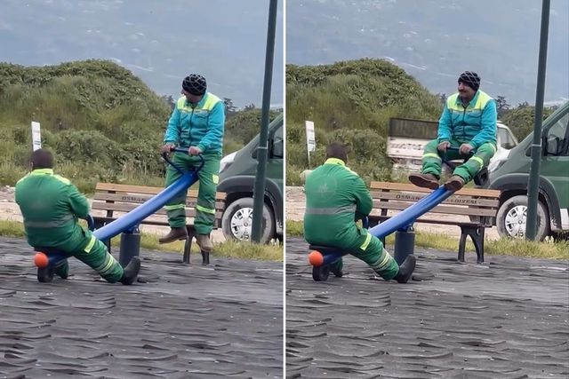 Dinlenmek için bank yerine tahterevalliyi tercih eden Akbulut ile Taş, dakikalarca eğlenip, adeta çocukluklarına döndü. Günün iş stresini ve yorgunluğunu çocuk gibi eğlenerek atan işçileri bir mahalle sakini cep telefonuyla görüntüledi.