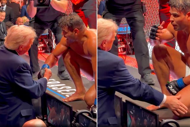 UFC 327’de galip gelen Paulo Costa, maç sonrası kafesten atlayarak ABD Başkanı Donald Trump’ın yanına gitti. İkili tokalaşırken Costa’nın “Size teşekkür etmek istedim” dediği, Trump’ın ise “Bir dövüşçü olmak için fazla yakışıklısın ama çok iyi bir dövüşçüsün” sözleri dikkat çekti. O anlar sosyal medyada hızla yayıldı.