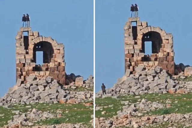 Şanlıurfa'da yaklaşık 2 bin yıllık olduğu belirlenen Nemrut'un Tahtı olarak bilinen Yakup Manastırı'nın kalıntıları üzerinde 2 kişinin halay çekmesi cep telefonuna yansıdı.
