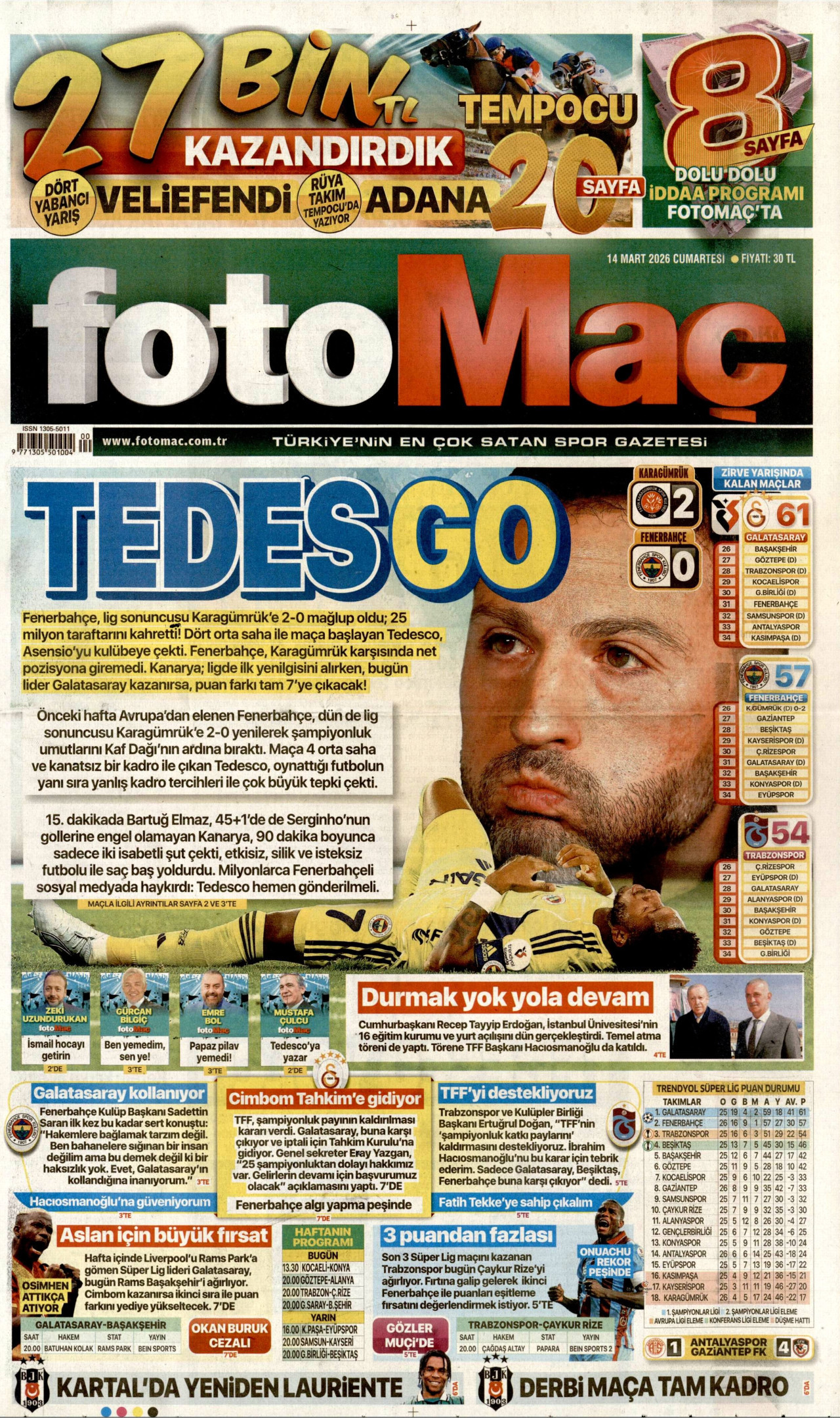 FOTOMAÇ Gazetesi 14 Mart 2026, Cumartesi Günü Manşeti