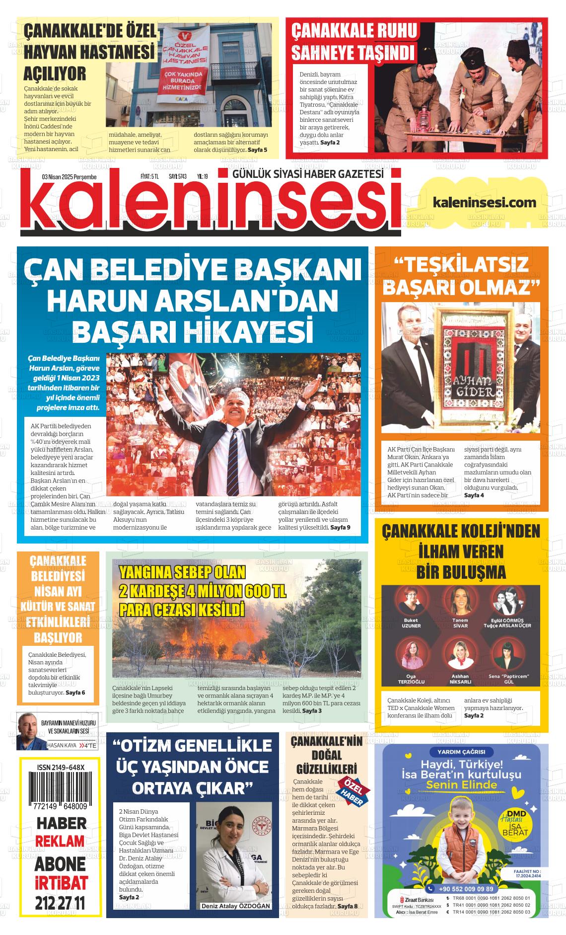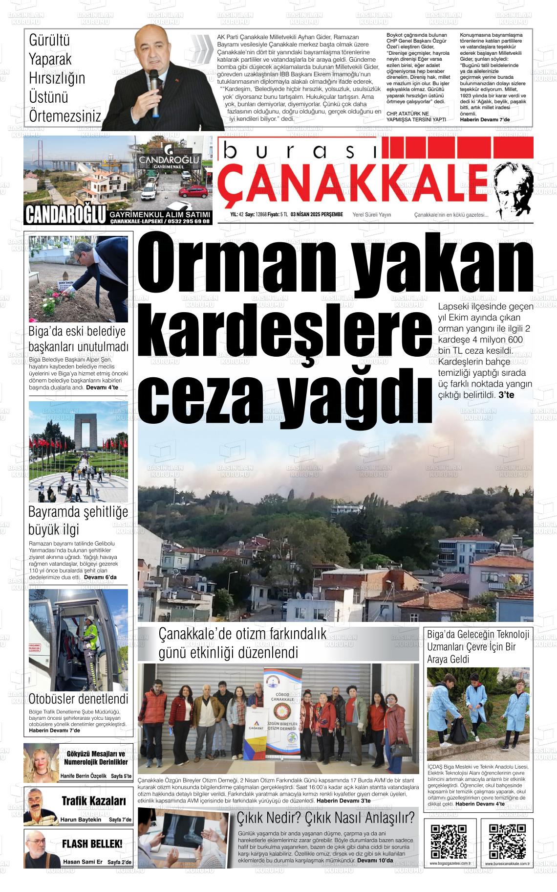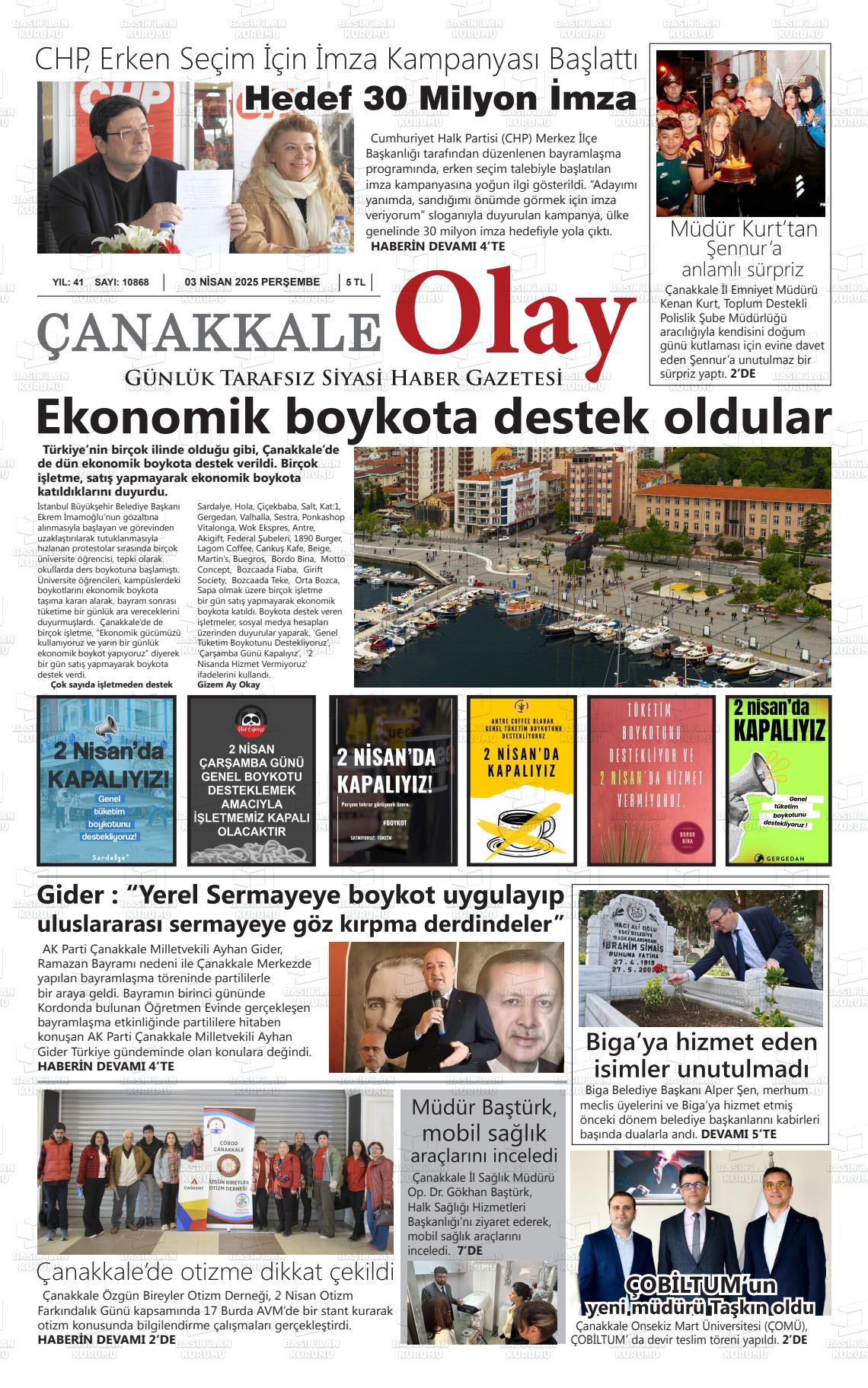 Çanakkale Yerel Gazeteleri 09 Mart 2026, Pazartesi Günü Manşeti